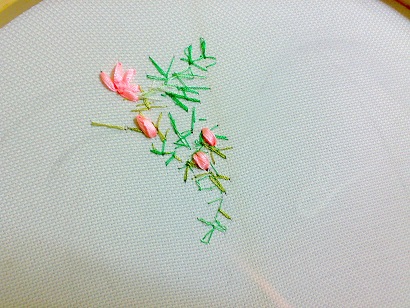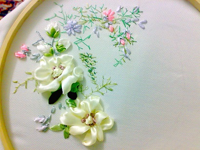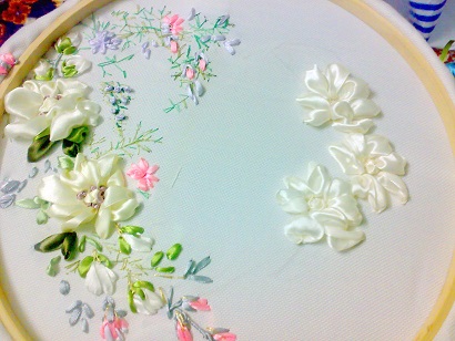 اول با نخ گلدوزی ساقه و اینا دوختم با چند رنگ سبز و طلایی و با روبان ها طرح انداختم روش آخرهم رنگ آکرلیک زدم..خیلی ساده بود اما چون رنگ های ملایمی داره به دل میشینه