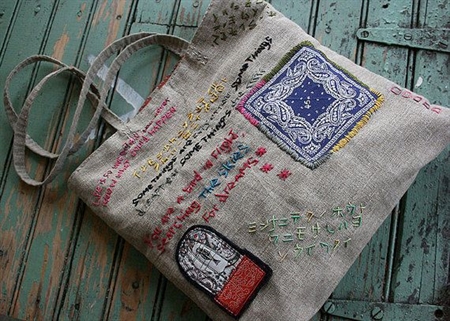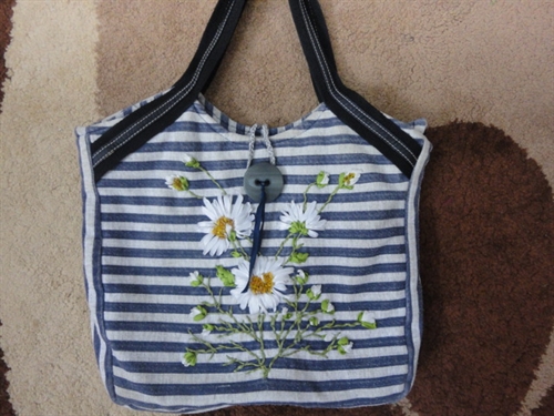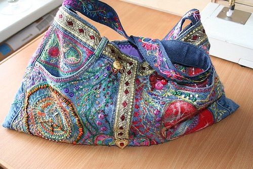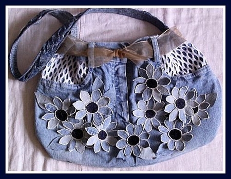 او از شلوار لی های قدیمی یه کیف خوشگل درست کرده و با استفاده از روبان دوزی و گلدوزی تزیین کرده.